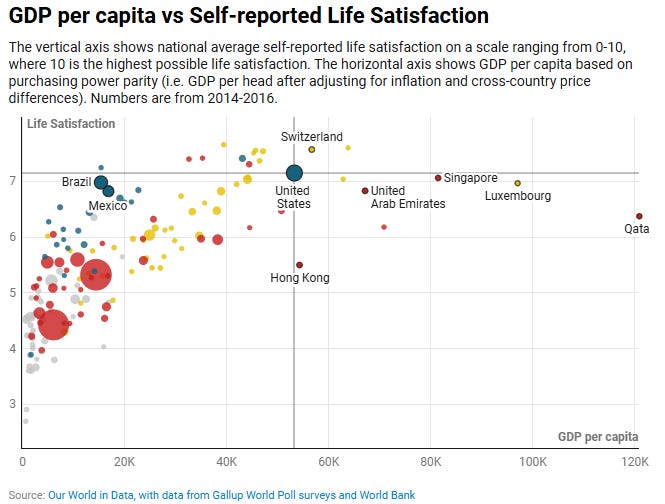 But sometimes you really do need to use areas. The most common case I’ve encountered is when a scatterplot needs a third dimension. For example, this chart below shows the relationship between countries’ wealth and happiness, showing an upward but tapering trend. However, there’s a bunch of small countries who are outliers, and that’s not a coincidence; perhaps they’re an urban-heavy city-state (like Hong Kong, Singapore, Luxembourg) or a tiny oil-rich country (UAE, Qatar). These small countries should be given less weight when looking for patterns, and a smaller size bubble indicates that.